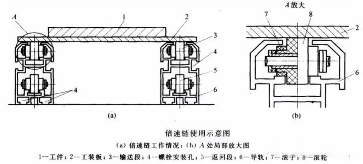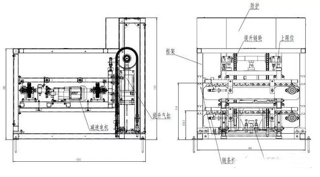 倍速鏈有雙層倍速鏈和單層倍速鏈。單層倍速鏈一般為環(huán)形,首尾相連;雙層倍速鏈上層用來生產(chǎn),下層跑空板,而回板機(jī)實(shí)現(xiàn)了上下層之間的輪轉(zhuǎn)。一般回板機(jī)由動(dòng)力部分和頂升部分組成,動(dòng)力部分有:驅(qū)動(dòng)鏈條或皮帶、電機(jī)、機(jī)架;頂升部分有:頂升氣缸、直線導(dǎo)軌滑塊、機(jī)架、配重(根據(jù)負(fù)載大小決定)頂升鏈輪、鏈條、護(hù)罩等等。