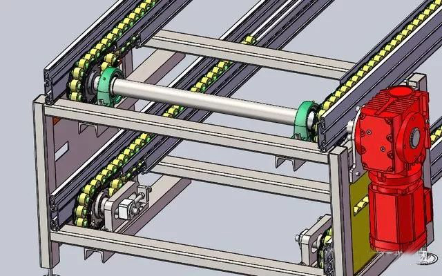 主動(dòng)端由軸承座、倍速鏈輪、電機(jī)、機(jī)架、倍速鋁型材組成。